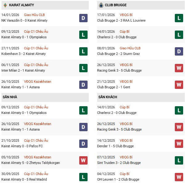 Thống kê phong độ Kairat Almaty vs Club Brugge: