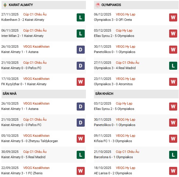 Thống kê phong độ Kairat Almaty vs Olympiacos: