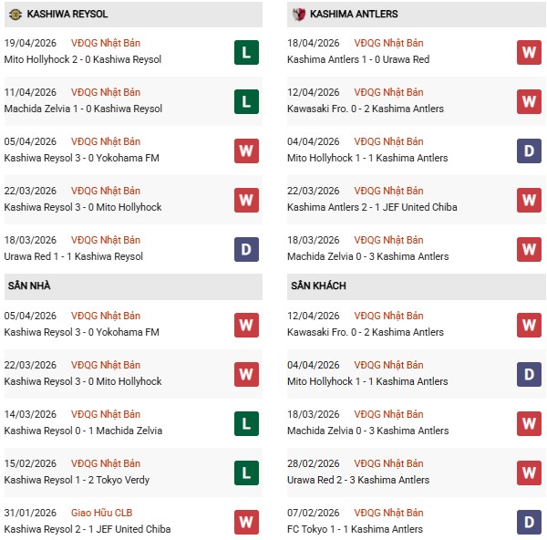Thống kê phong độ Kashiwa Reysol vs Kashima: