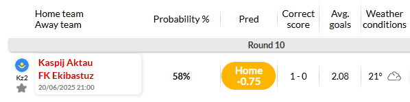 Lùi lại giải hạng 2 Kazakhstan 2024, Kaspiy Aktau thi đấu không tốt khi thua cả 2 trận đối đầu trước Ekibastuz. Quay lại với mùa giải 2025, vị thế của Kaspiy Aktau đã hoàn toàn thay đổi và họ tự tin sẽ trả món nợ trước Ekibastuz ở trận đối đầu đêm nay. Cần nhớ, Kaspiy Aktau đang là đội bóng số 1 của giải hạng 2 Kazakhstan khi thắng tới 8 trận và chỉ thua 1 lần sau 9 trận đã đá. Hiện tại, họ đứng đầu bảng và bỏ xa đội nhì bảng tới 4 điểm.