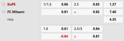 Thông tin tỷ lệ bóng đá KuPS vs Milsami: