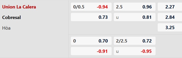 Theo kèo châu Á, La Calera được xếp cửa trên với mức chấp 1/4 bàn. Đây là tỷ lệ cho thấy giới chuyên môn đánh giá cao lợi thế sân nhà của La Calera. Chủ nhà Cobresal đang có phong độ khá tốt và không dễ bị khuất phục, tuy nhiên việc phải làm khách vẫn là bất lợi nhất định. Trong bối cảnh La Calera thường chơi khá chắc chắn khi gặp các đối thủ ngang tầm, cửa trên vẫn là lựa chọn đáng cân nhắc theo kèo châu Á.