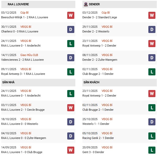 - La Louviere thắng 1, hòa 1 trong 2 trận đối đầu Dender gần đây.