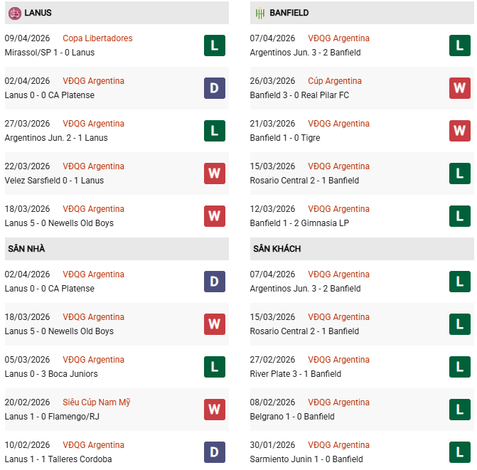 Thống kê phong độ Lanus vs Banfield: