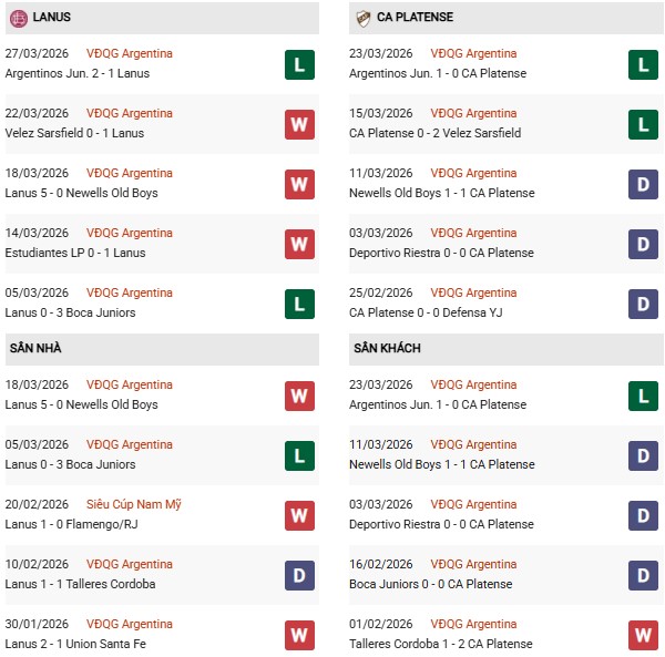 Thống kê phong độ Lanus vs Platense: