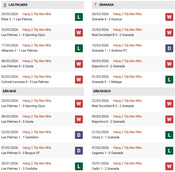 Phong độ gần đây của Granada không tệ khi thắng 3, hòa 1 và chỉ thua 1 trong 5 trận gần nhất, trong đó vừa đánh bại Huesca 4-2. Tuy nhiên, thành tích sân khách của họ vẫn thiếu sự ổn định khi từng thua Ceuta và Leganes trong thời gian gần đây. Việc phải làm khách trước một Las Palmas khát điểm hơn sẽ là thử thách không đơn giản.