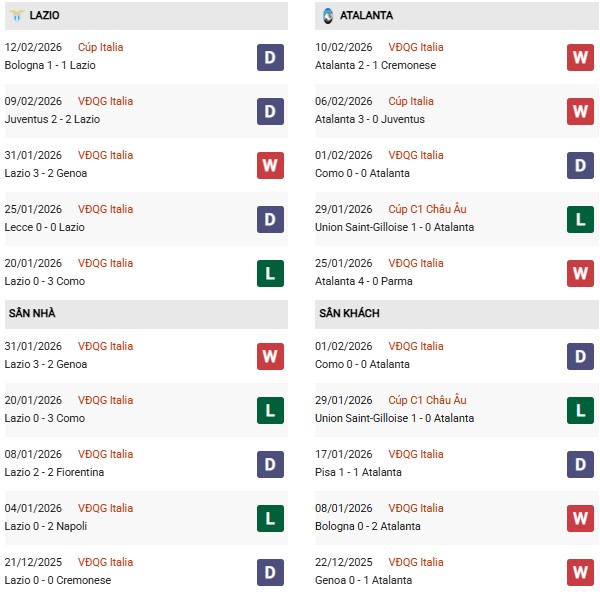 - Lazio thắng 4, hòa 4, thua 2 trong 10 trận gặp Atalanta gần đây.
