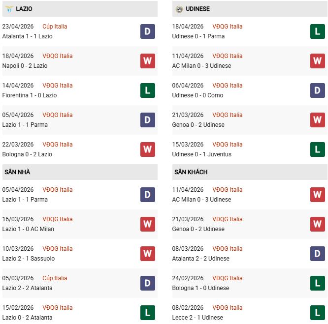- Trên sân nhà, Lazio thắng 4, thua 2 trước Udinese.