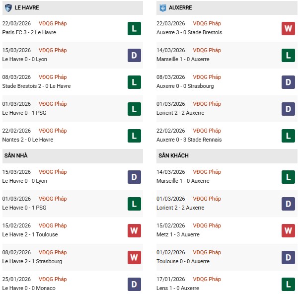 Sân nhà đương nhiên là lợi thế số 1 của Le Havre và điểm lạc quan là 5/6 thắng lợi mà họ đã giành được tại Ligue 1 2025/26 diễn ra trên thánh địa Stade Océane. Cùng với đó kể từ ngày Auxerre trở lại sân chơi số 1 nước Pháp (mùa 2024/25), Le Havre thắng trọn vẹn 3 màn chạm trán giữa đôi bên.