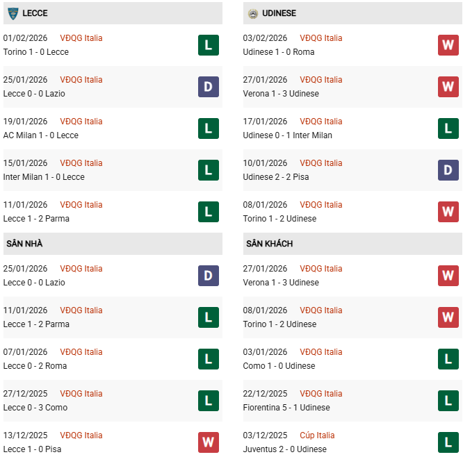 - Lecce thắng 2, hòa 2, thua 6 trong 10 trận gặp Udinese gần đây.