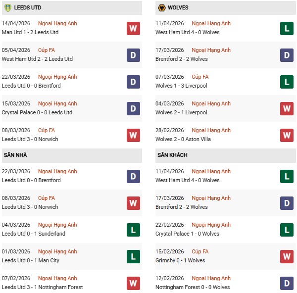 - Trên sân nhà, Leeds United thắng 4, thua 5 trước Wolves.