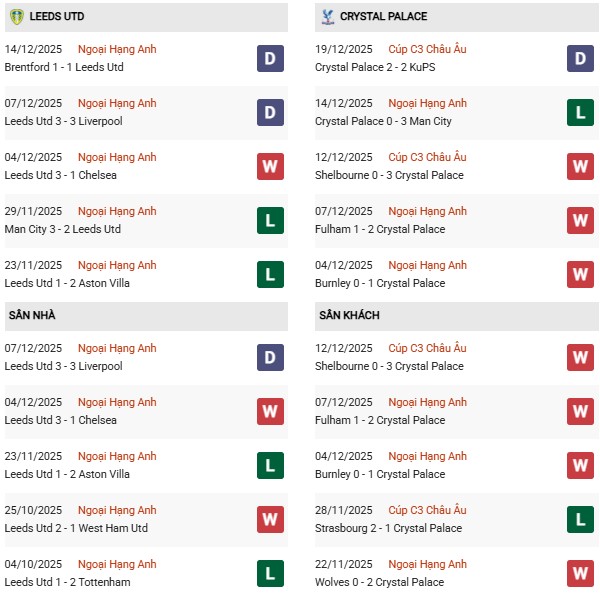 Thống kê phong độ Leeds vs Crystal Palace: