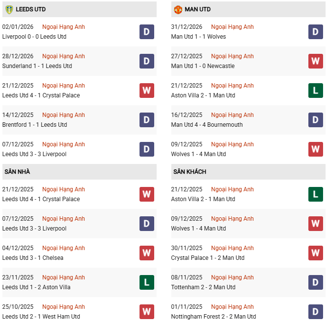 Thống kê phong độ Leeds vs MU: