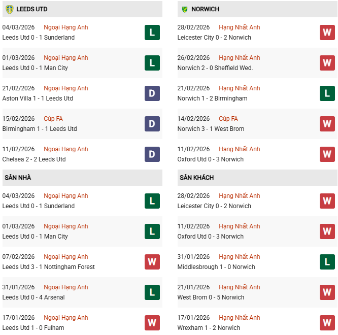 Bên cạnh đó, lịch sử đối đầu cũng đang đứng về phía đội chủ nhà. Leeds bất bại trong 8 lần chạm trán Norwich gần đây, trong đó có tới 6 chiến thắng. Đáng chú ý, tại Elland Road, Leeds đã thắng cả 4 lần tiếp đón Norwich gần nhất.