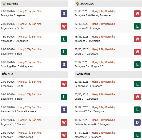 - Trên sân nhà, Leganes thắng 4, hòa 3 trước Zaragoza.