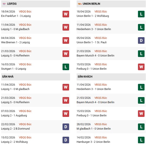 Ở vòng đấu mới nhất, Leipzig và Union Berlin có kết quả khác nhau. Trong khi Leipzig đánh bại Frankfurt 3-1 thì Union Berlin bại trận 1-2 trước Wolfsburg. Lúc này trên BXH Bundesliga 2025/26, Leipzig đứng thứ 3 khi có 59 điểm. Họ hơn đội đứng thứ 5 (vị trí dự Europa League) tới 5 điểm.