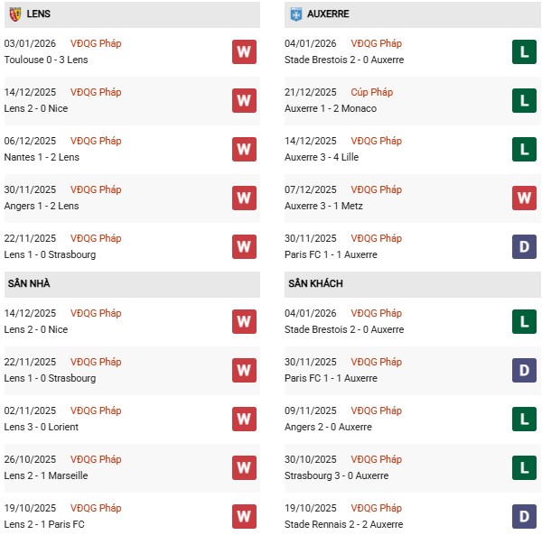 - Trên sân nhà, Lens thắng 7, thua 2 trước Auxerre.