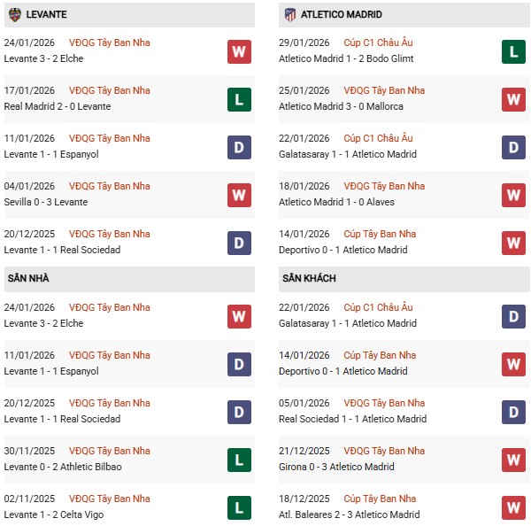 - Levante thắng 2, hòa 3, thua 5 trong 10 trận gặp Atletico Madrid gần đây.