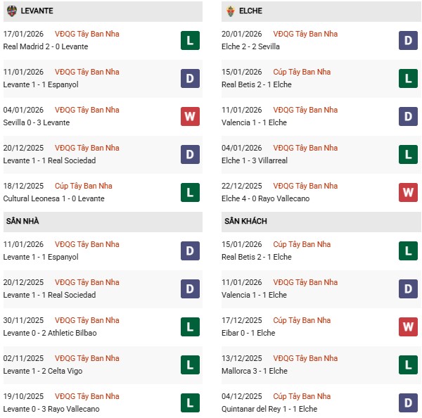 Thống kê phong độ Levante vs Elche: