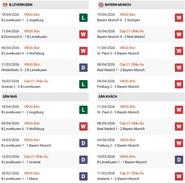 Thống kê phong độ Leverkusen vs Bayern Munich: