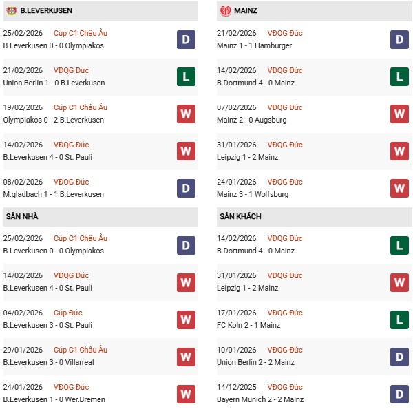 - Trên sân nhà, Leverkusen thắng 7, thua 2 trước Mainz.