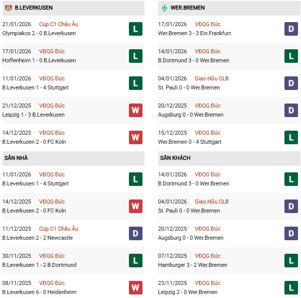 Ngày 16 tháng 1, Werder Bremen đã cầm hòa Eintracht Frankfurt với tỷ số 3-3. Bremen cũng đã cầm hòa Leverkusen với tỷ số 3-3 vào tháng 8 năm 2025, và nếu họ tránh được thất bại ở trận lượt về, họ sẽ kéo dài chuỗi trận bất bại trước đội chủ nhà lên 4 trận, trong khi một chiến thắng sẽ là chiến thắng thứ 2 của họ trong 4 lần đối đầu.