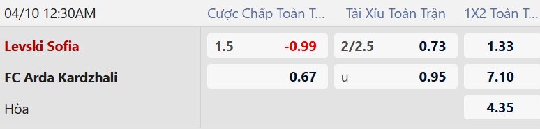 Thông tin tỷ lệ cược Levski Sofia vs Arda Kardzhali:
