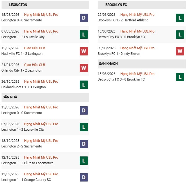 Thống kê phong độ Lexington vs Brooklyn: