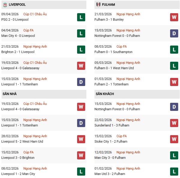 - Trên sân nhà, Liverpool thắng 7, thua 2 trước Fulham.