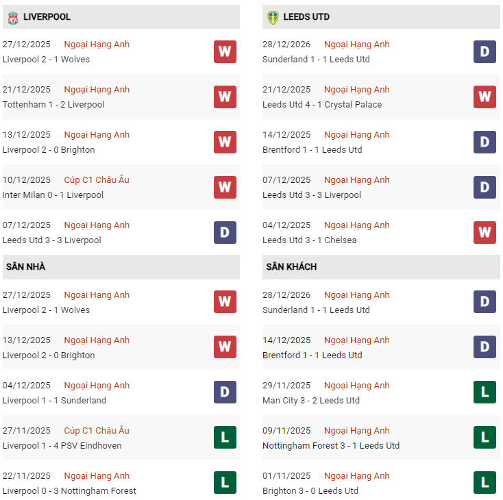 Đối thủ của Liverpool ở trận đấu này là Leeds, một đội bóng ở thời điểm hiện tại không phải đối thủ dễ chơi. Trận hòa 1-1 đầy nỗ lực trên sân khách trước Sunderland hôm Chủ nhật đã giúp đội bóng của Daniel Farke vươn lên đứng thứ 16 trên BXH, tạo ra khoảng cách 7 điểm so với nhóm ba đội cuối bảng và kéo dài chuỗi trận bất bại lên 5 trận tại Premier League (2 thắng, 3 hòa). Tuy nhiên, ưu thế sân nhà cùng sự trở lại của nhiều trụ cột giúp Liverpool có cơ hội để tiếp tục kéo dài mạch trận chiến thắng.