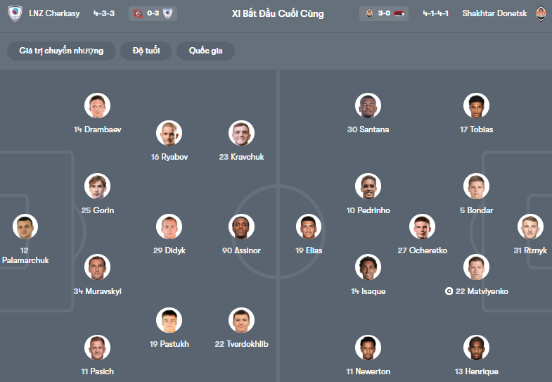 Đội hình dự kiến LNZ Cherkasy vs Shakhtar: