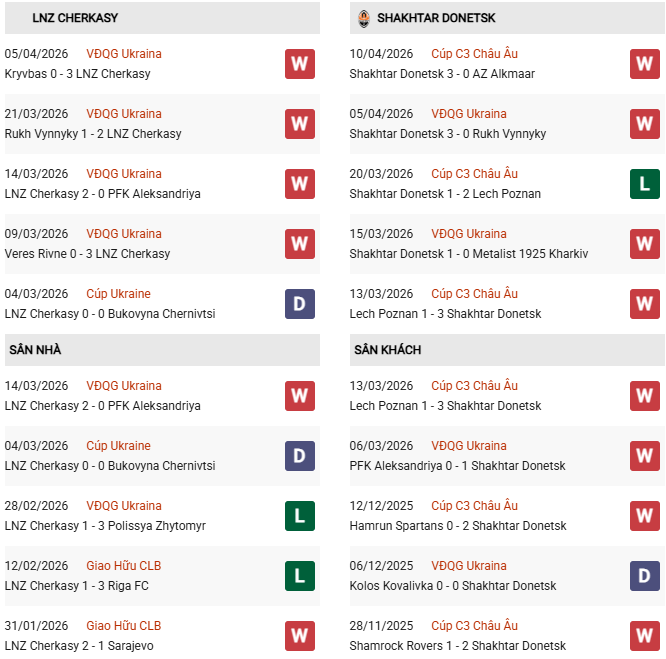 - LNZ Cherkasy thắng 2, thua 4 trong 6 trận gặp Shakhtar gần đây.