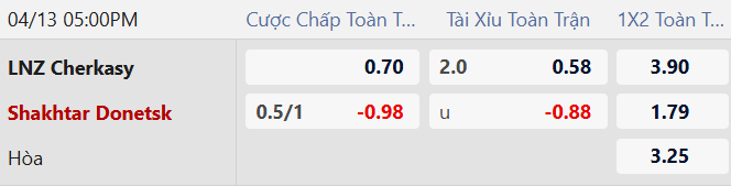 Thông tin tỷ lệ bóng đá LNZ Cherkasy vs Shakhtar: