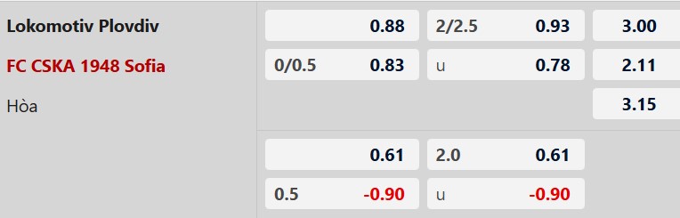 Thông tin tỷ lệ kèo Lok. Plovdiv vs CSKA 1948 Sofia: