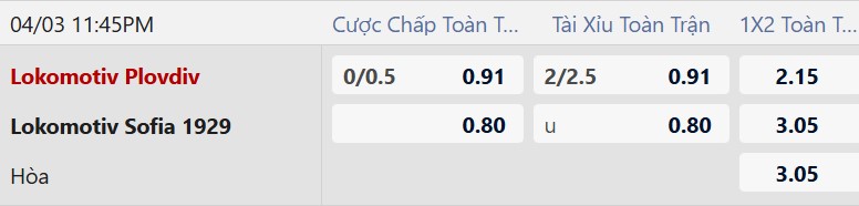 Thông tin tỷ lệ Lokomotiv Plovdiv vs Lokomotiv Sofia: