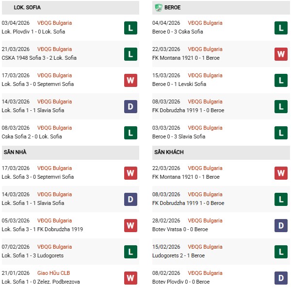 Thống kê phong độ Lokomotiv Sofia vs Beroe: