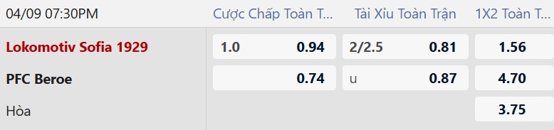 Thông tin tỷ lệ Lokomotiv Sofia vs Beroe: