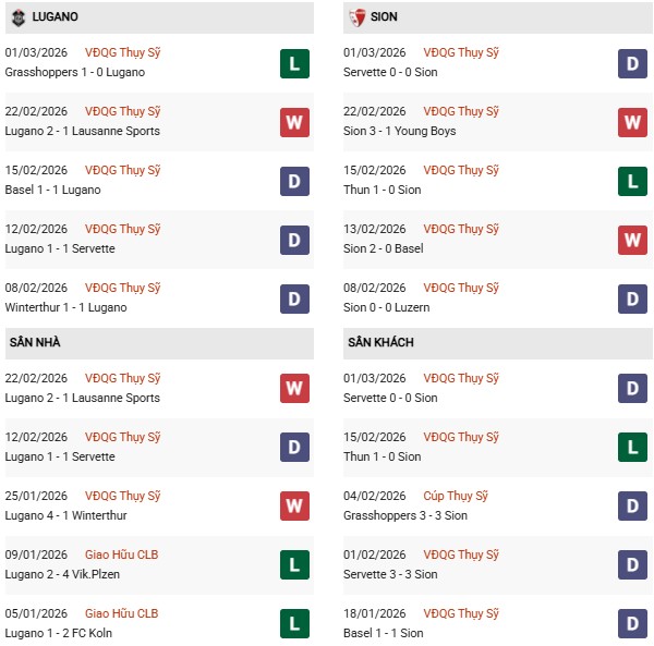 Ở phía đối diện, Sion cũng không đạt trạng thái hoàn hảo khi vừa bị Servette cầm hòa. Tuy nhiên, chiến thắng 3-1 trước Young Boys trước đó cho thấy họ vẫn tiềm ẩn sự bùng nổ. Tính từ đầu năm 2026, Sion chỉ thua duy nhất 1 trận trước FC Thun, còn lại duy trì thành tích bất bại, một thông số đủ để tạo sự tự tin khi hành quân đến sân của Lugano.