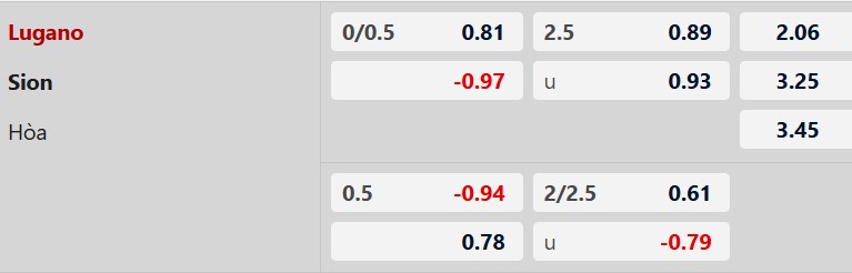 Thông tin tỷ lệ cược Lugano vs Sion: