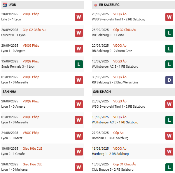 Thành tích đối đầu Lyon vs RB Salzburg: