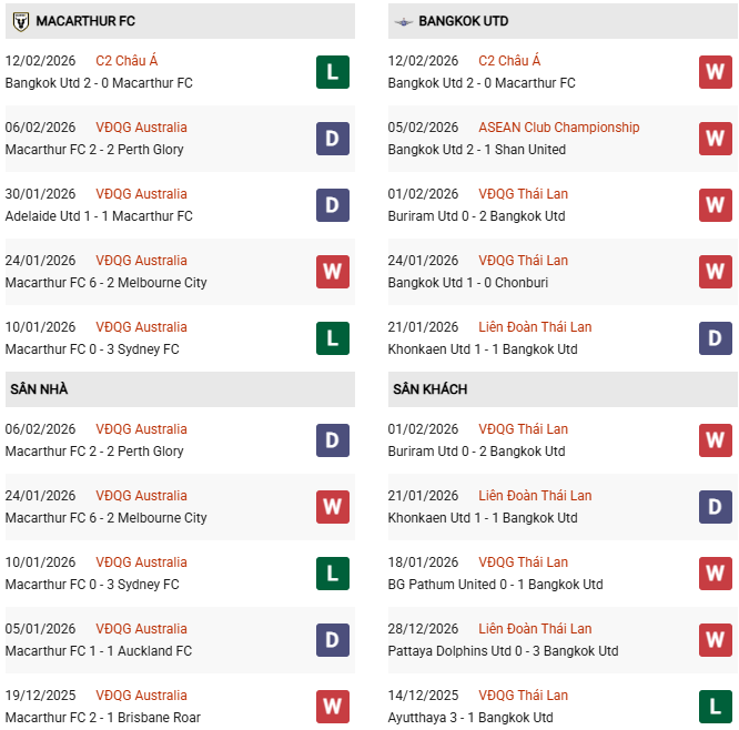 Thống kê phong độ Macarthur vs Bangkok United: