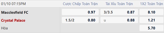 Thông tin tỷ lệ cược Macclesfield vs Crystal Palace: