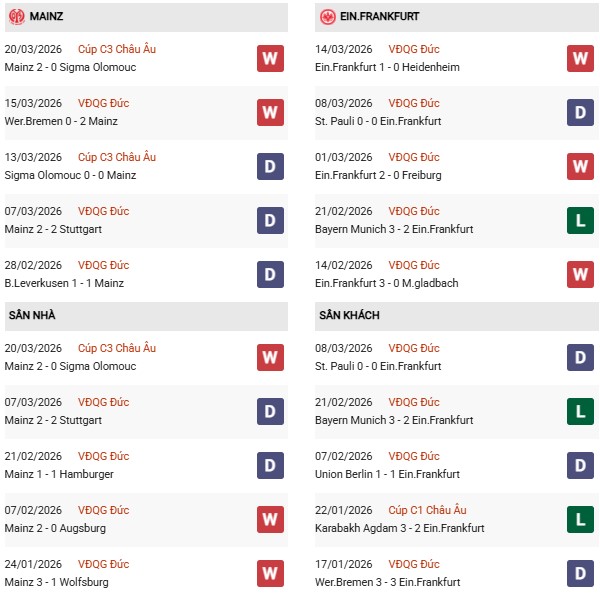Thống kê phong độ Mainz vs Eintracht Frankfurt: