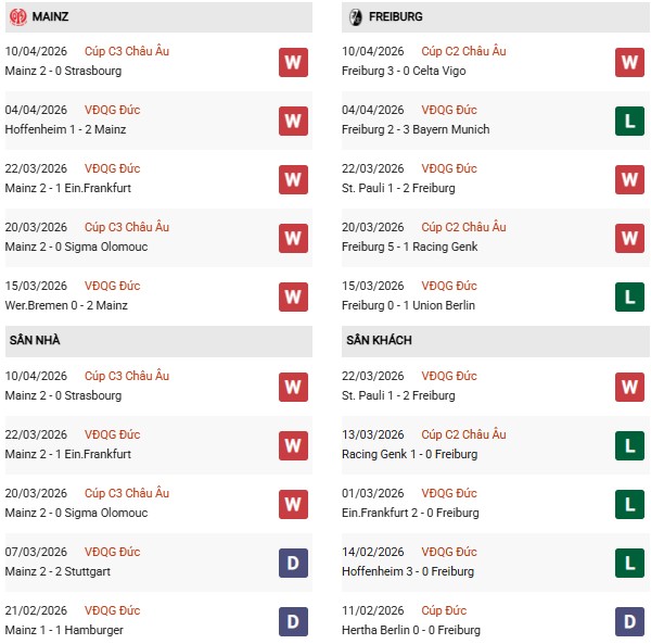 - Trên sân nhà, Mainz thắng 3, thua 2 trước Freiburg.