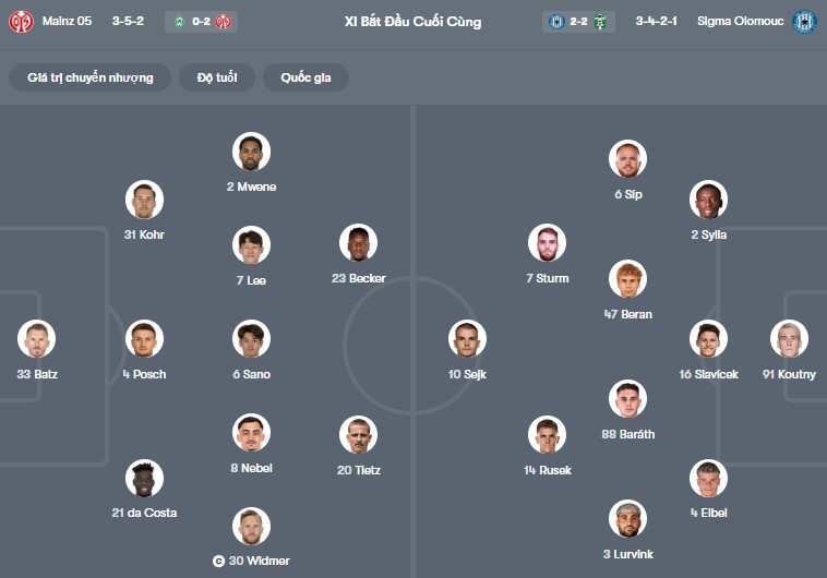 Đội hình dự kiến Mainz vs Sigma Olomouc: