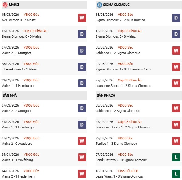 Thống kê phong độ Mainz vs Sigma Olomouc: