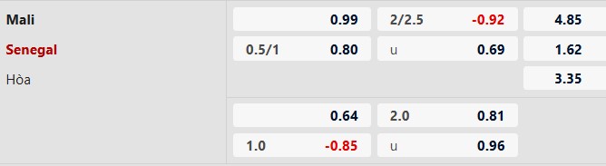 Senegal thắng theo châu Á: Senegal thắng 4/6 cuộc đối đầu gần nhất, thắng 7/9 trận gần đây, thắng 3 và hòa 1, thua 1 ở 5 trận vừa qua trên sân trung lập. Trong khi đó, Mali thua 3, hòa 1 và chỉ thắng 1 ở 5 trận gần đây; thua 3, hòa 1 ở 4 trận gần nhất trên sân trung lập. Do đó, giới mộ điệu có thể đặt niềm tin vào Senegal ở trận này.