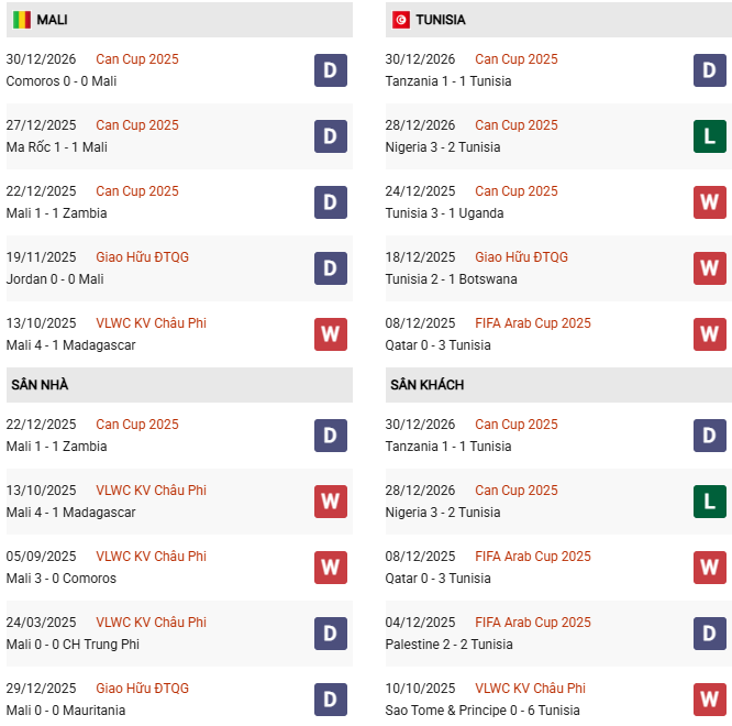 Tại vòng bảng AFCON 2025, Tunisia xếp thứ 2 ở bảng C khi có 4 điểm. Tương tự Tunisia, Mali cũng xếp thứ 2 ở bảng A.