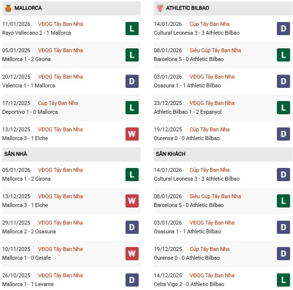 - Trên sân nhà, Mallorca thắng 3, thua 2 trước Athletic Bilbao.