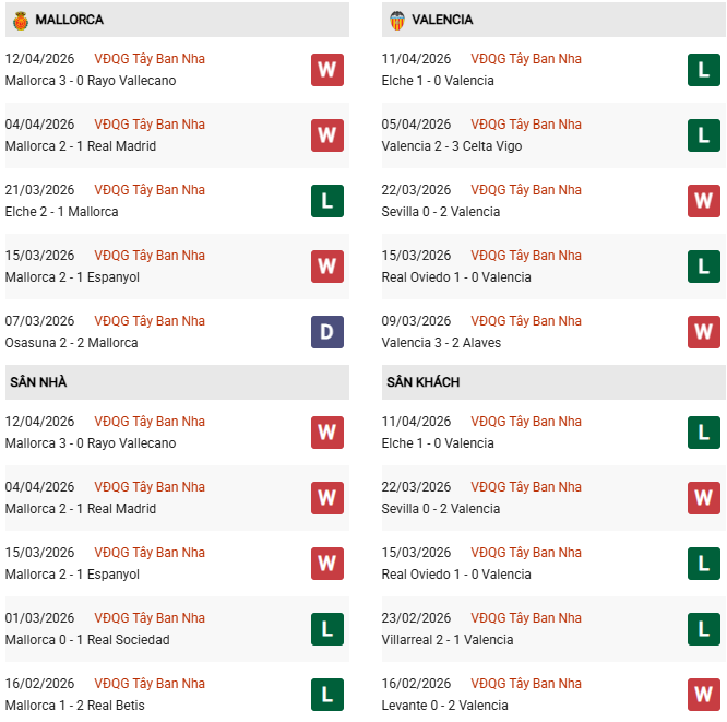 - Trên sân nhà, Mallorca thắng 6, thua 2 trước Valencia.